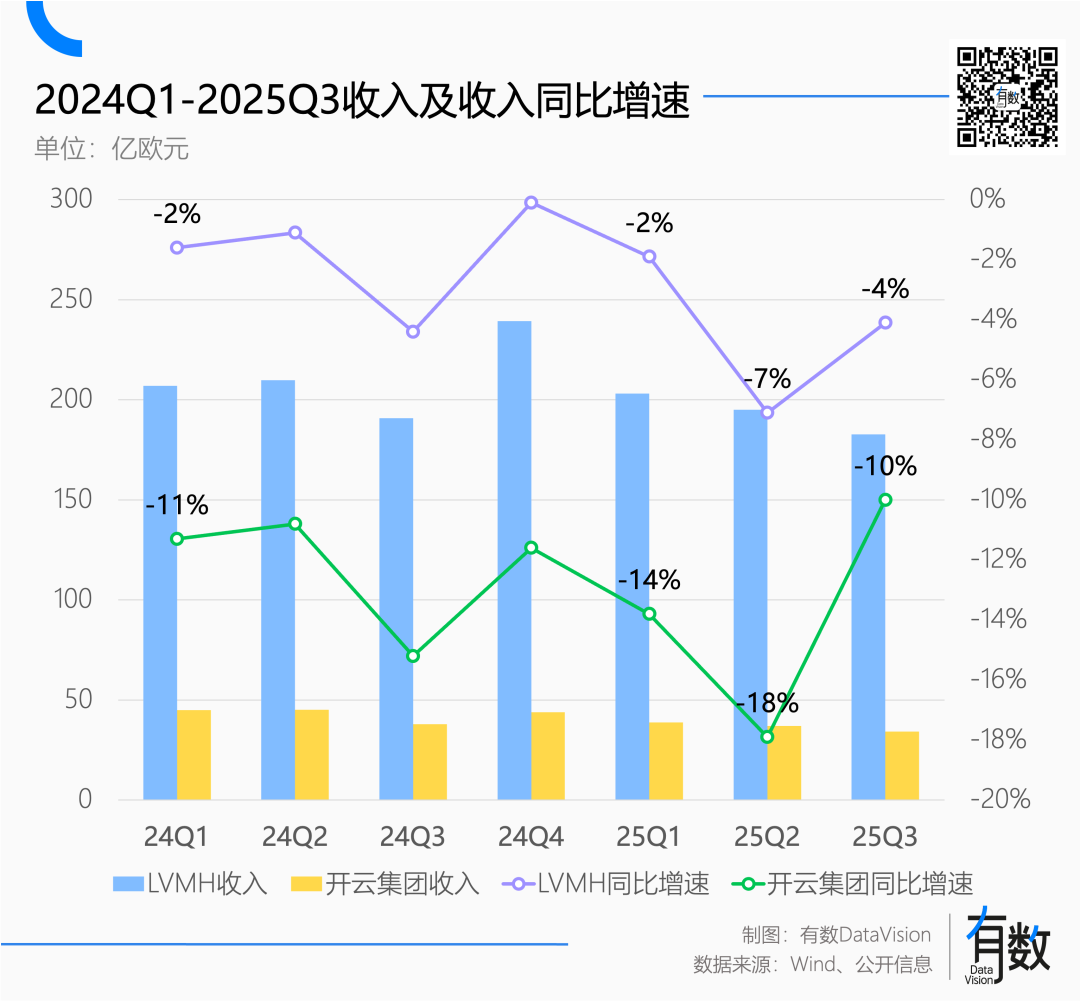 LVMH品牌矩阵相对多元,皮糙肉厚之下勉强能稳住阵脚。经历六个季度下滑后,在2025年Q3终于止跌,营收同比下滑4%,有机增速1%[6]。
