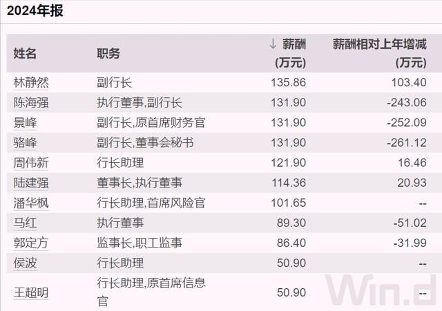 根据年报,2024年,高管薪酬最多是副行长林静然,大约136万元,其他三位副行长都是132万元。行长助理薪酬多超过百万元,卸任的董事长陆建强114万元。