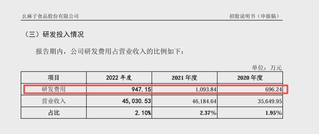 也在这份向深交所递交的IPO申报材料中,幺麻子披露称其2022年的研发费用为947.15万,占其同期营收比重为2.10%。