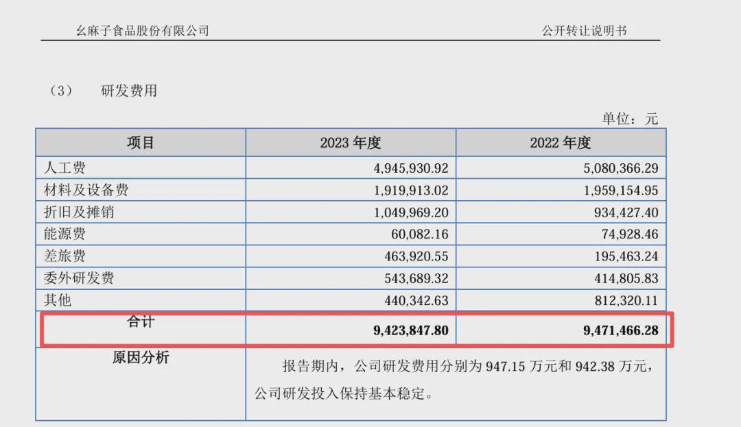 2024年6月,幺麻子申报新三板挂牌时,同样在其向股转中心递交的公开转让说明书中称,在2022年中,研发费用也还依旧为947.15万元,且2023年的研发投入也高达942.38万,占当期营收比重1.73%。