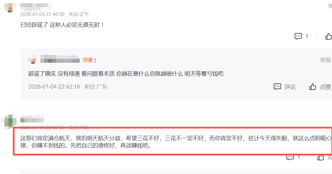 这哥们肯定满仓航天,就怕明天航天分歧,希望三花不好,三花不一定不好,而你肯定不好,估计今天得失眠,就这么点阴暗心理,你赚不到钱的。先把自己的德修好,再谈赚钱吧。