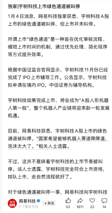 1月4日,在A股新年开市之前,网易科技报道了一个大消息。据网易科技,宇树科技A股绿色通道被叫停,但上市并未叫停。