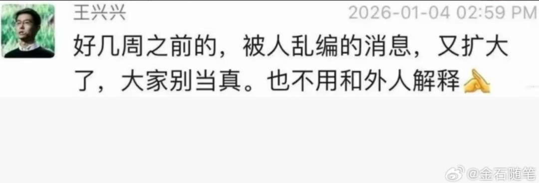 随后,宇树科技创始人王兴兴在朋友圈澄清,“好几周之前的消息,被人乱编的消息,又扩大了,大家别当真,也不用和外人解释”。就金石杂谈所知,2025年12月初,这则消息就已经传了出来,这次应该属于二次被爆。
