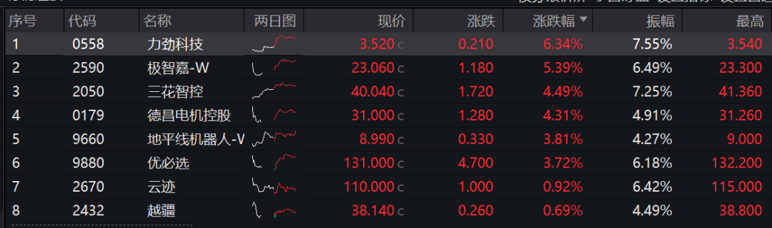 就在1月2号,港股新年开门红,科技互联网、商业航天、机器人、半导体等集体爆发。其中,机器人方面,力劲科技涨超6%,极智嘉涨5.4%,三花智控涨4.49%,地平线、优必选、德昌电机等涨约4%。