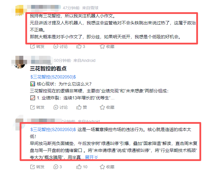 有股民表示,“元旦讲话才提及人形机器人,我想这会监管绝对不会头铁跳出来说过热了”;还有股民表示,“这是一场蓄意操控市场的违法行为。核心就是造谣的成本太低!”