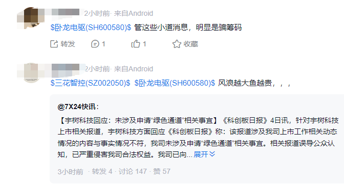 在卧龙电驱的讨论区,股民也纷纷表示:风浪越大鱼越贵;小道消息,明显是骗筹码。