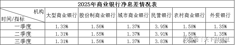净息差在经历了一段时间的持续下滑后,在2025年第三季度显现出企稳迹象。据国家金融监督管理总局统计,到2025年第三季度商业银行净息差降至1.42%。其中,大型商业银行、城市商业银行、民营银行、外资银行的净息差呈下降趋势。
