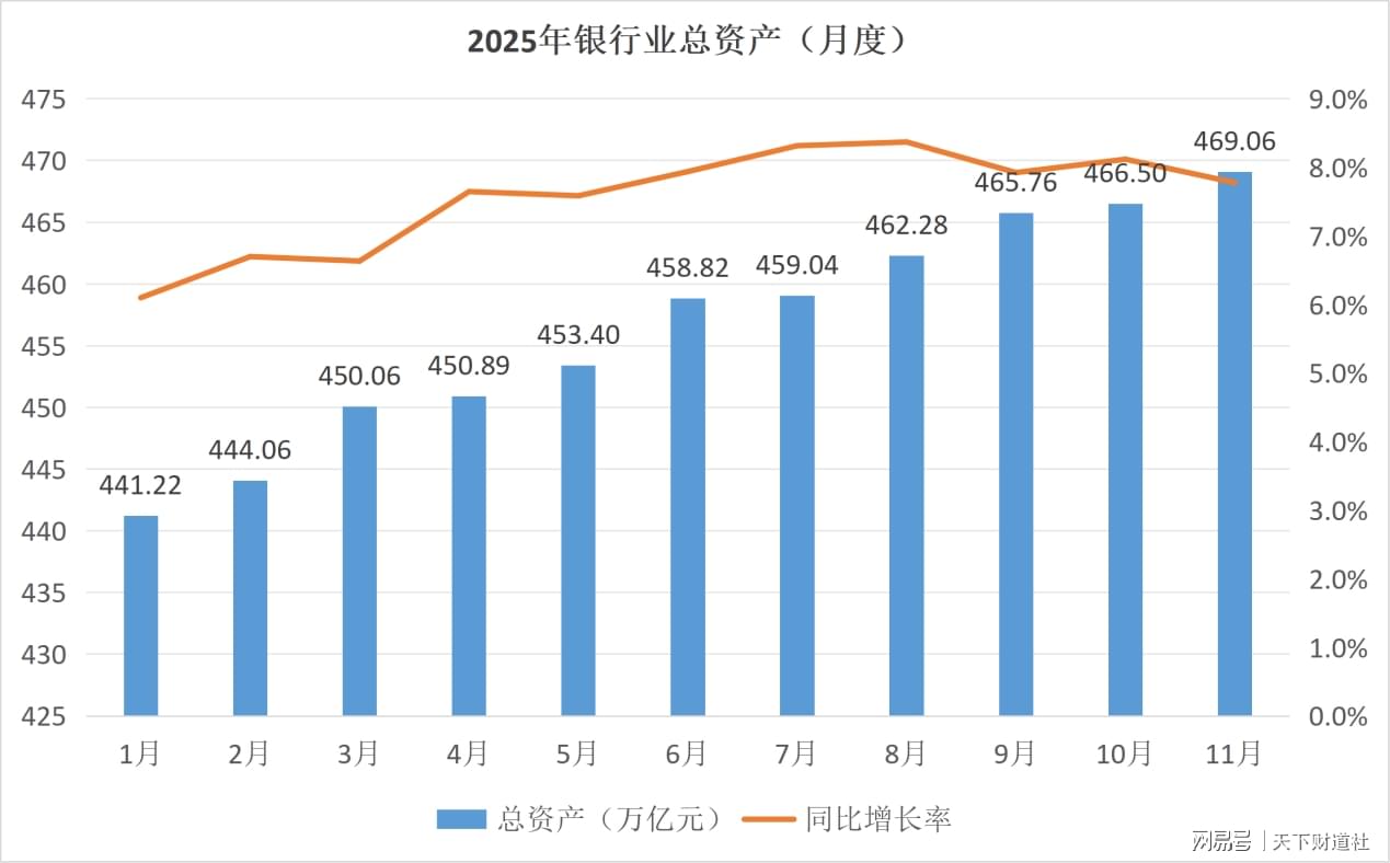 同时,2025年银行业呈现出矛盾而又真实的双面特征。截至2025年11月末,我国银行业总资产已达到469万亿元。
