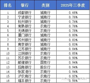 2025年三季度上市银行不良率前16
