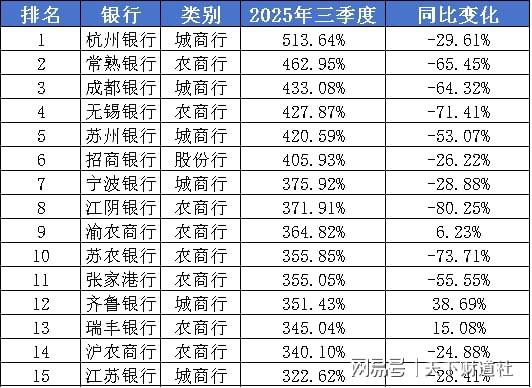 城市商业银行方面,杭州银行、常熟银行和成都银行的拨备覆盖率表现亮眼,分别达到513%、462%和433%,均远超监管要求。
