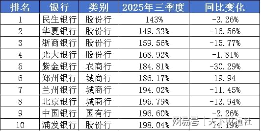 部分2025年三季度上市银行拨备覆盖率后10