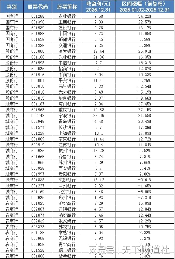 2025年42家上市银行股价涨幅情况