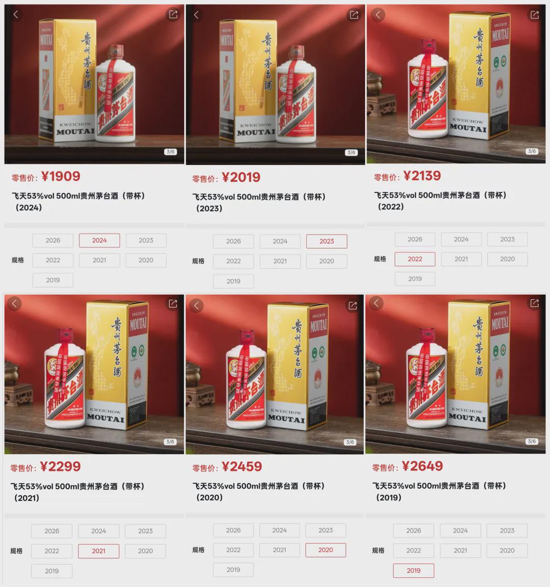 这次i茅台不仅上线了2026年的飞天茅台,未来还将上线其他年的茅台,目前已公布了售价,但还未开售。2019年至2024年的飞天茅台每瓶价格分别为2649元、2459元、2299元、2139元、2019元、1909元。可见,老酒还是有较高的溢价。