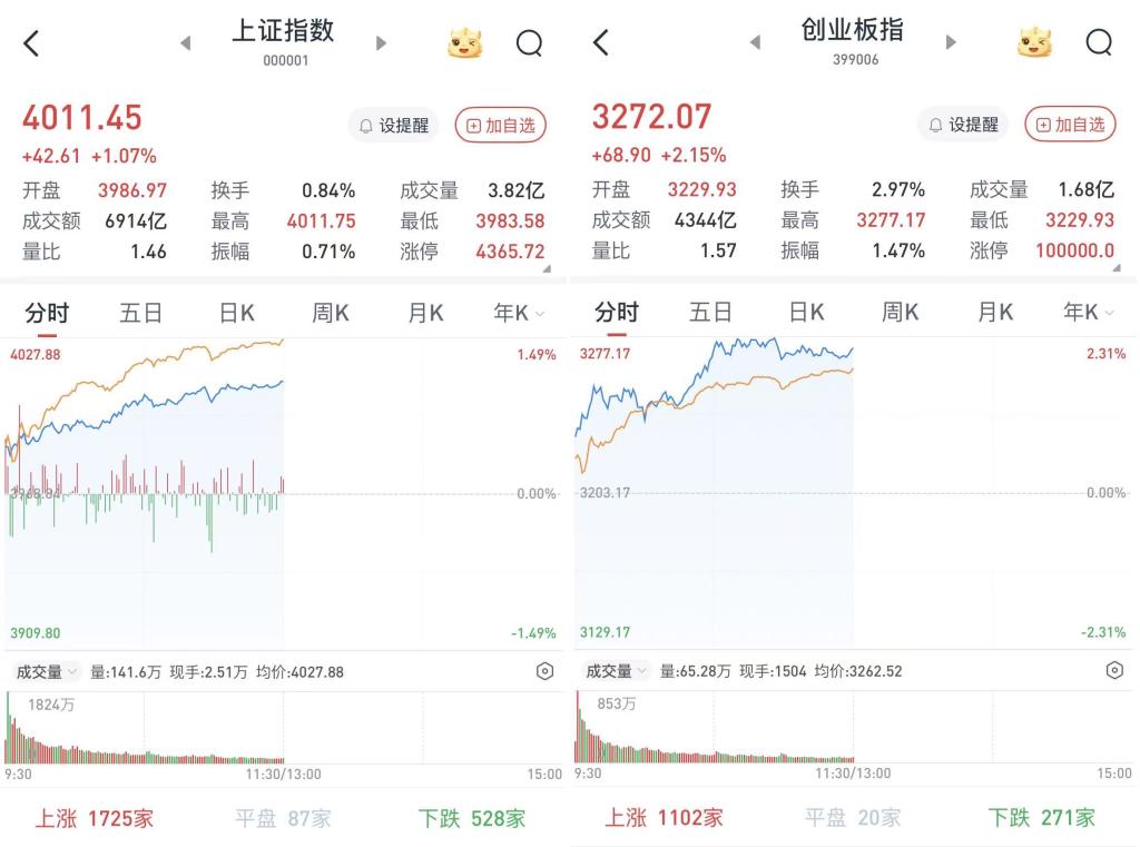 至午间收盘,上证综指涨1.07%,报4011.45点;科创50指数涨4.05%,报1398.61点;深证成指涨1.87%,报13777.32点;创业板指涨2.15%,报3272.07点。