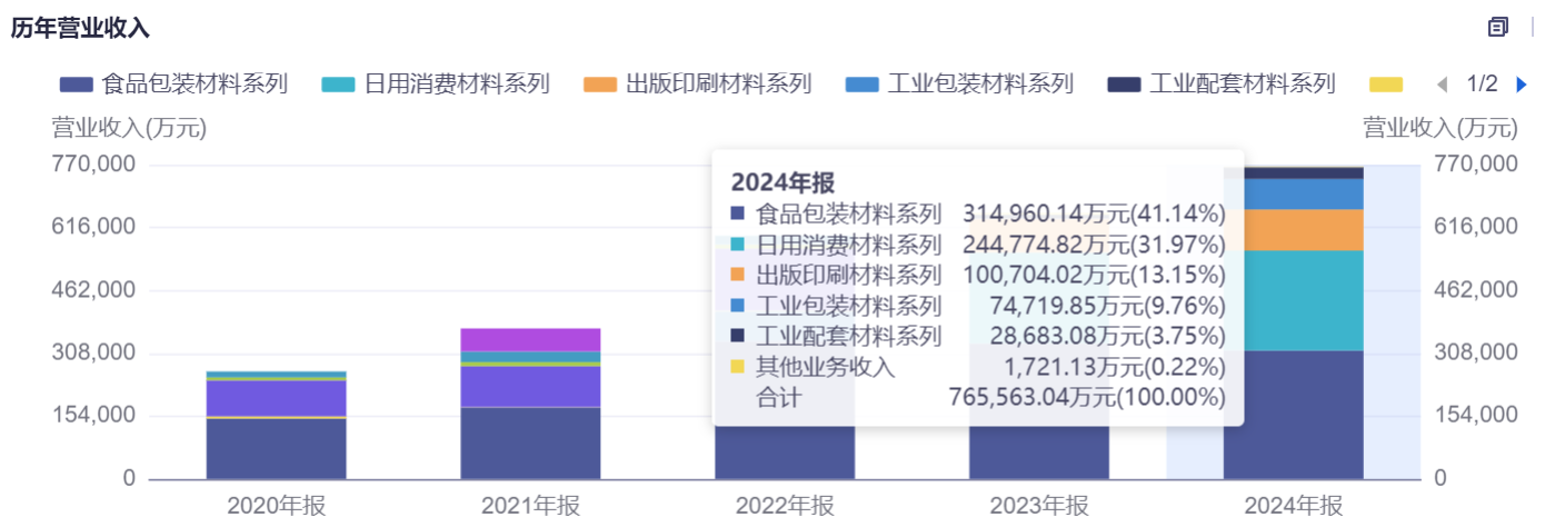 其中,食品包装材料系列营收占比近40%,主要用于外卖餐盒、食品容器,直接接触食材,对安全性和耐温性要求高;日用消费材料系列营收占比近30%,核心产品格拉辛纸(标签离型材料),是快递面单、商品标签的底层材料。