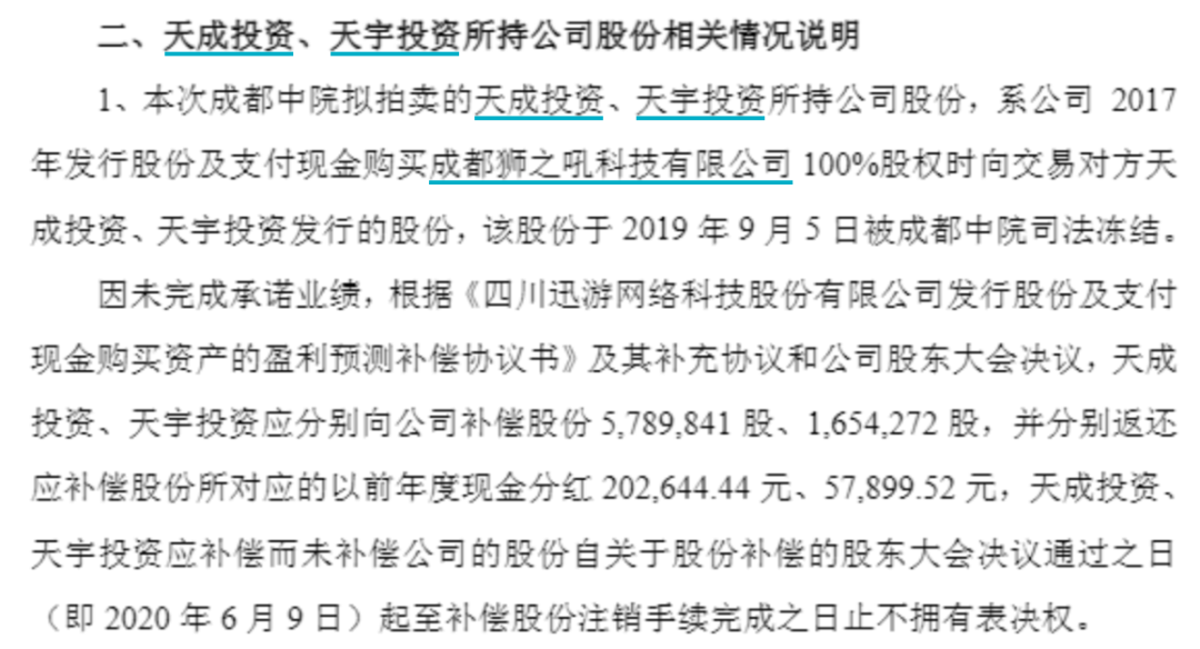 本次拟拍卖的天成投资、天宇投资所持公司股份,系迅游科技2017年发行股份及支付现金购买成都狮之吼科技有限公司100%股权时向交易对方天成投资、天宇投资发行的股份,于2019年9月5日被成都中院司法冻结。
