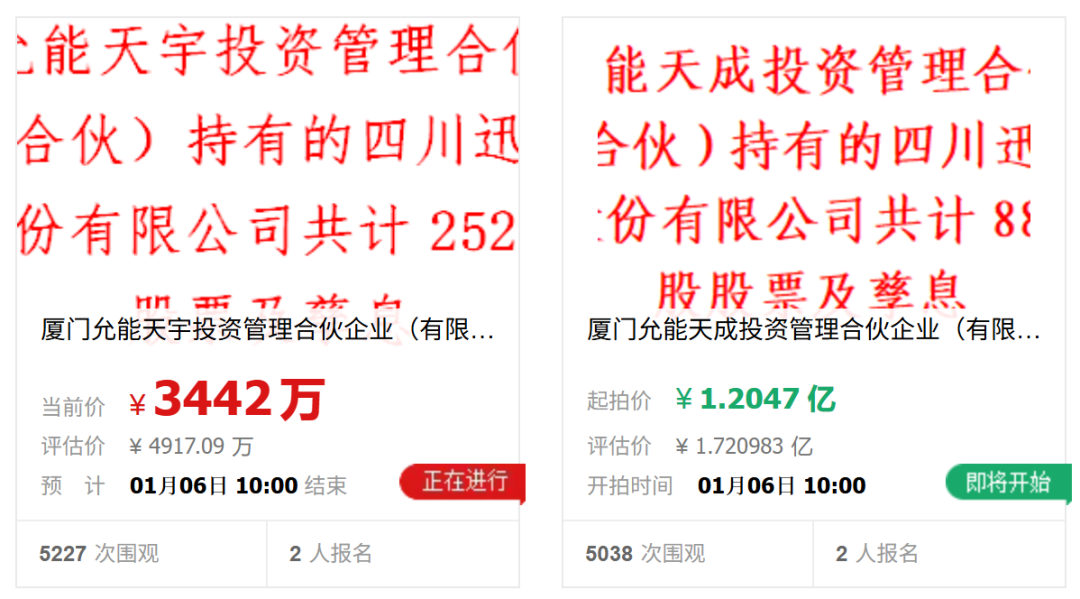 公司合计持股5%以上股东厦门允能天成投资管理合伙企业(有限合伙)(下称“天成投资”)、厦门允能天宇投资管理合伙企业(有限合伙)(下称“天宇投资”)所持公司合计1137.80万股股份(起拍总价约1.55亿元),将被四川省成都市中级人民法院于2026年1月初在淘宝司法拍卖网络平台进行公开拍卖。