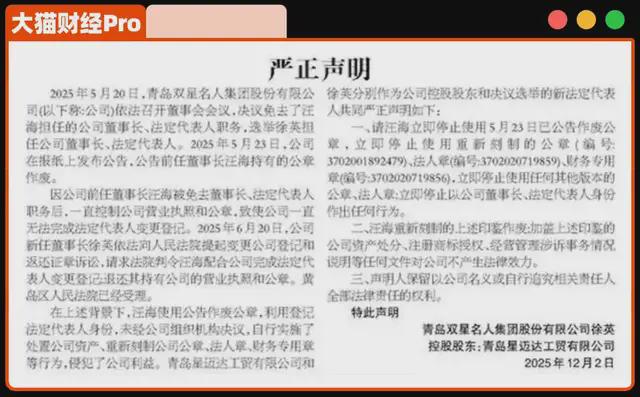 但是,5月份,徐英就成为了双星名人董事长,并启用了新公章,12月份干脆登报声明。