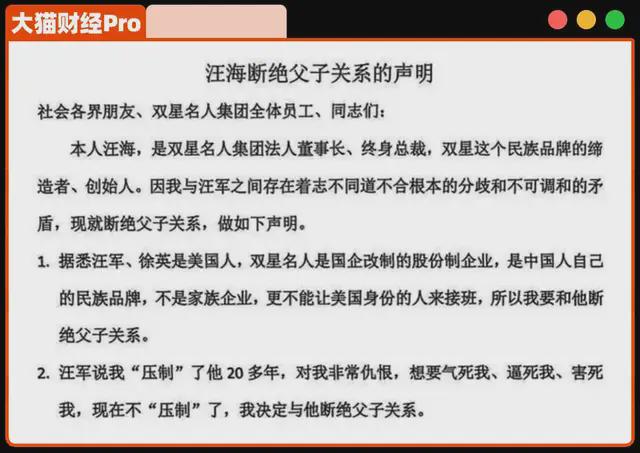 1月3日,84岁的双星名人集团创始人汪海发布声明,与儿子汪军、儿媳徐英正式断绝关系。