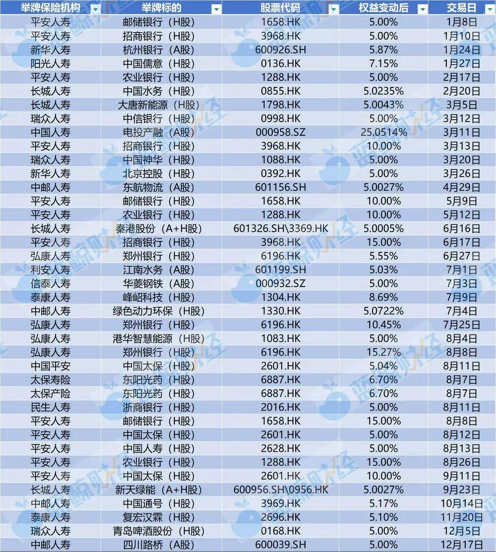 瑞众人寿、泰康人寿及新华保险在2025年各有不少于2次的举牌动作;阳光人寿、民生人寿、利安人寿、信泰人寿等亦在2025年达成举牌。