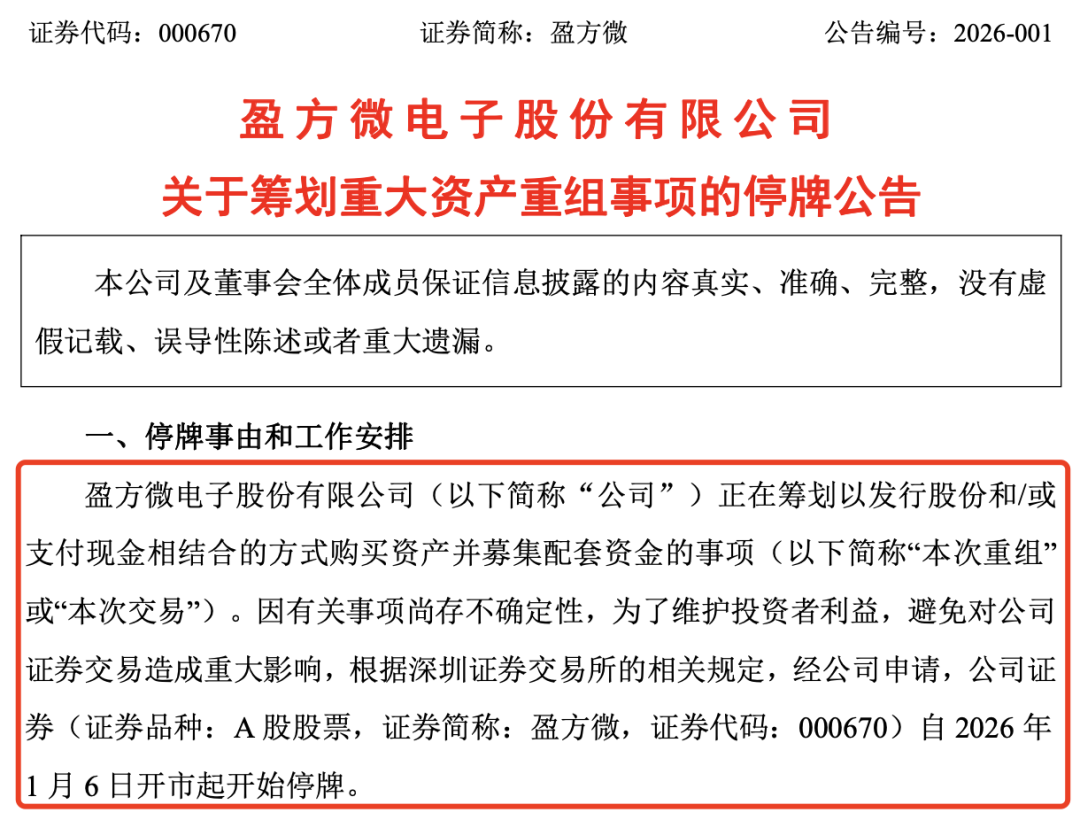 1月5日晚间,盈方微发布公告称,公司正在筹划以发行股份和/或支付现金相结合的方式购买资产并募集配套资金。因有关事项尚存不确定性,为了维护投资者利益,避免对公司证券交易造成重大影响,根据深圳证券交易所的相关规定,经公司申请,公司股票自2026年1月6日开市起开始停牌。
