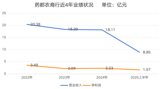 事实上,自王锋接任董事长后,药都农商行的业绩就开始持续下滑。2022年至2025年上半年,该行营业收入增速分别为-10.53%、-10.26%、-0.99%、-1.57%,同期净利润增速为-26.76%、-40.09%、2.23%、1.57%,净利润近两年即使转为升势,主要原因也是之前两年大幅下跌而导致基数过低。