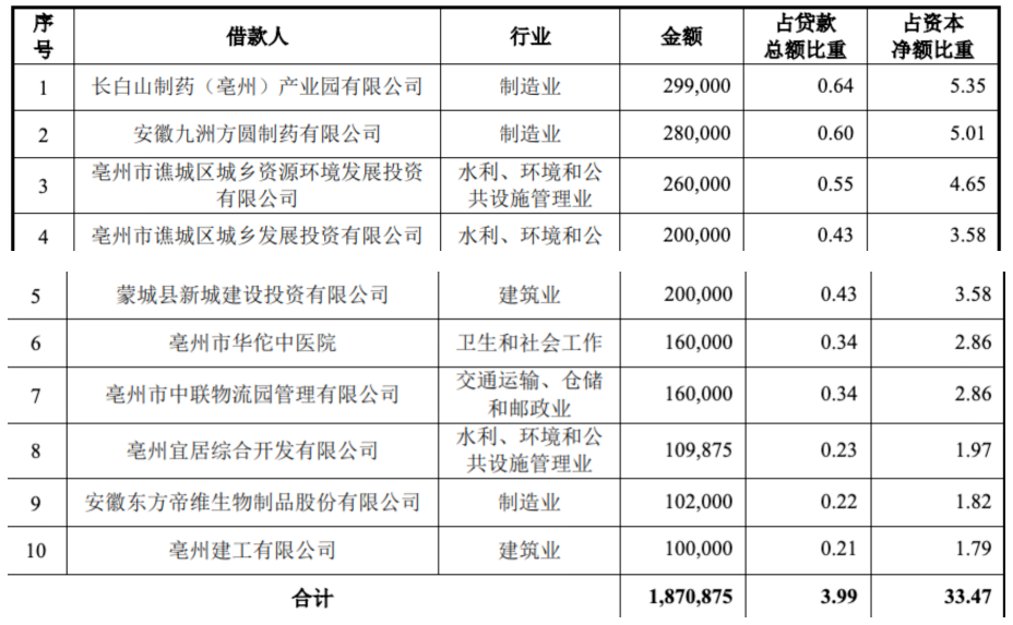 招股书显示,2022年上半年,该行前十大单一借款人名单中,有五家公司都是该行股东关联方。其中,亳州市谯城区城乡资源环境发展投资有限公司借款2.6亿元,该公司为药都农商行第二大股东谯城区商汤国有资本运营有限公司控制的企业。