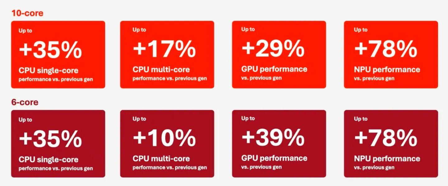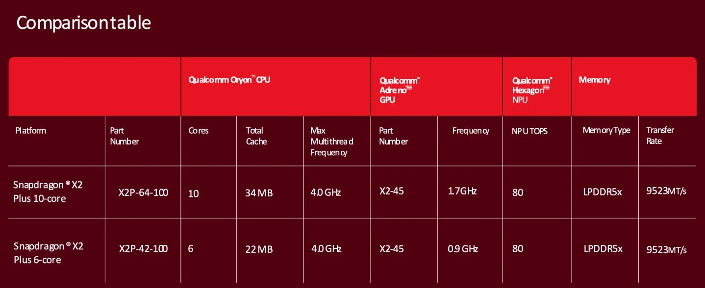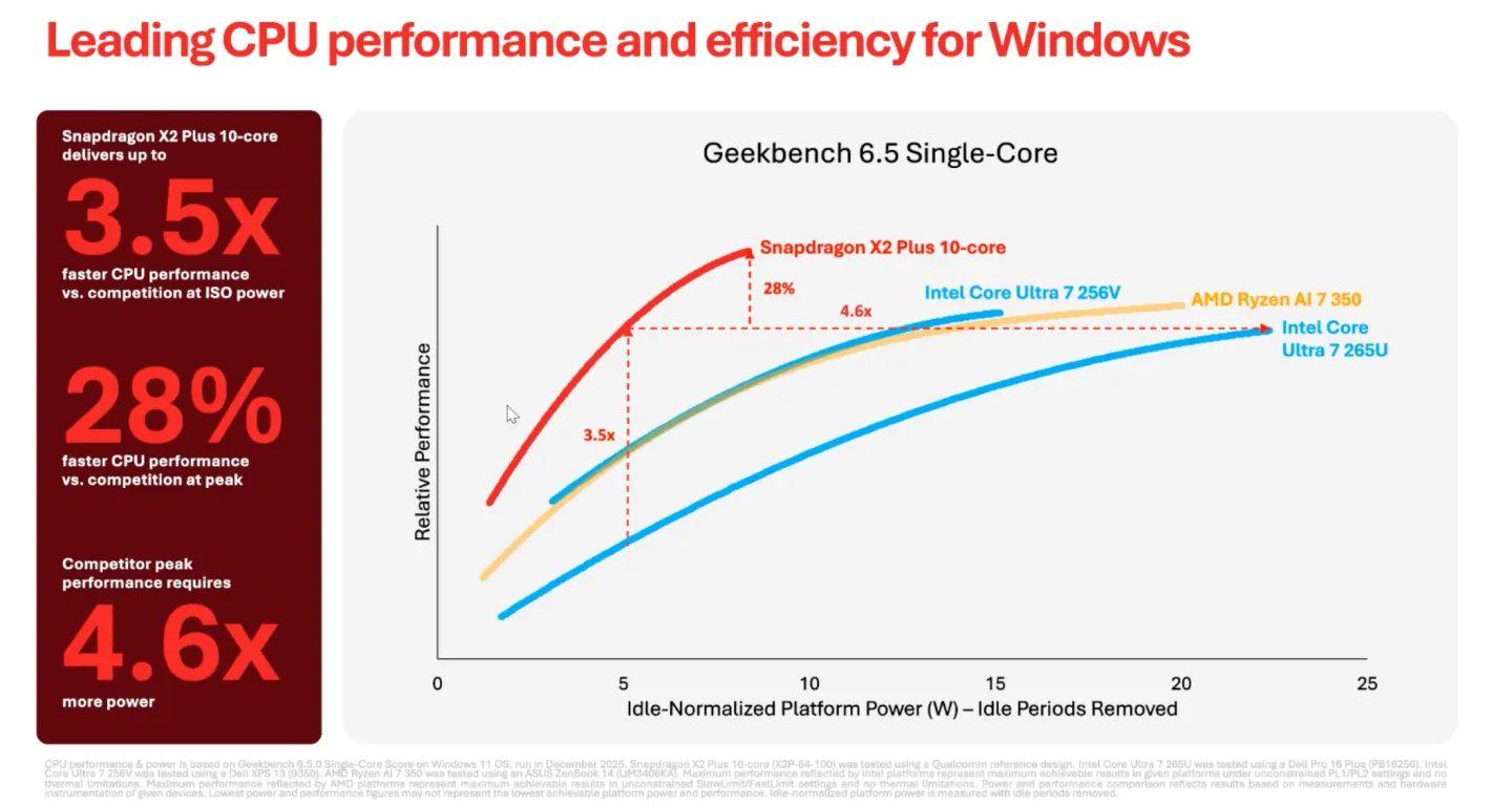 媒体表示,尽管 X2 Plus 的性能不及 X2 Elite,但它的表现并不弱。10 核和6 核版本的 CPU 核心数量确实少于 Elite 系列(Elite 分别拥有18 核和12 核),但高通表示,在 CPU 性能和能效方面,X2 Plus 依然可以明显领先英特尔低功耗的 Lunar Lake 或 Arrow Lake 处理器。