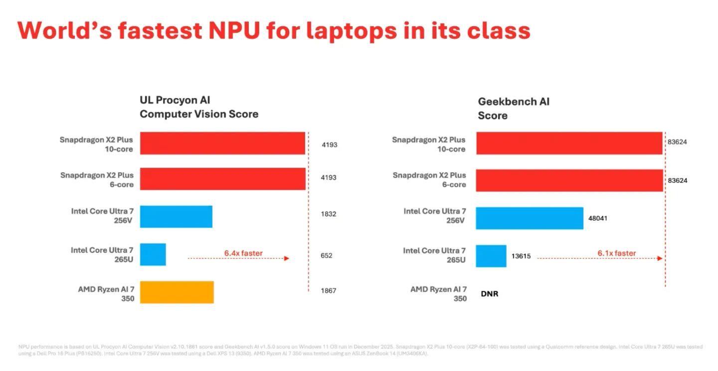 在 AI 任务方面,X2 Plus 依然配备了与高端型号相同的80 TOPS 神经网络处理单元。高通宣称,这使其成为“同级别笔记本中全球最快的 NPU”。