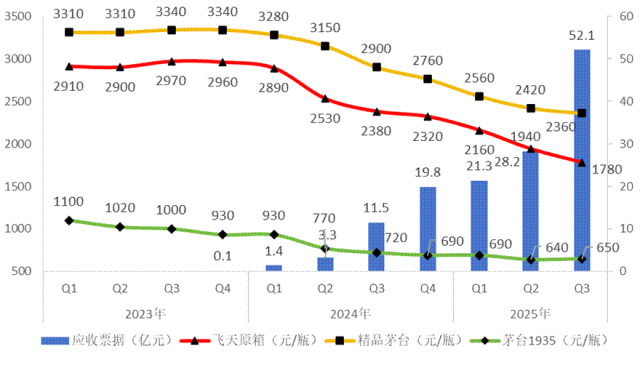 图:2023-2025年贵州茅台应收票据与核心单品批价对比图,数据来源:不二酱,公司公告