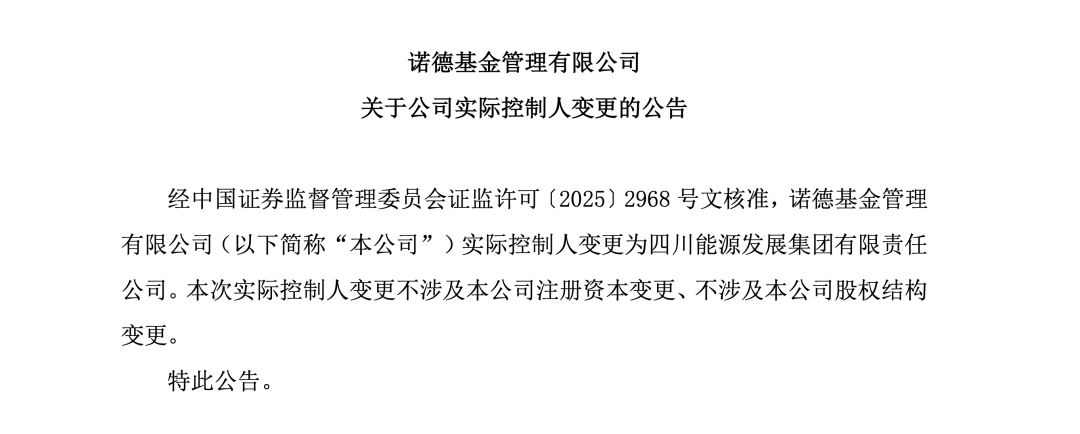 微成都报道诺德基金1月5日发布公告称,经中国证监会核准,诺德基金实际控制人变更为四川能源发展集团有限责任公司(下称四川能投)。公告称,本次实际控制人变更不涉及诺德基金注册资本变更,不涉及股权结构变更。
