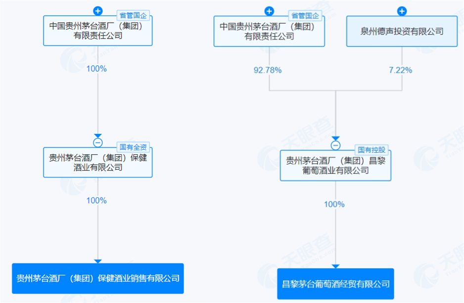 天眼查App显示,茅台保健酒销售公司控股股东为贵州茅台酒厂(集团)保健酒业有限公司(以下简称“茅台保健酒公司”),茅台葡萄酒经贸公司的控股股东为贵州茅台酒厂(集团)昌黎葡萄酒业有限公司(以下简称“茅台葡萄酒公司”),经过股权穿透,都属于茅台集团的控股孙公司。