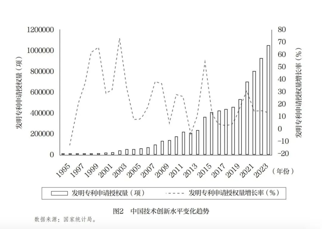 长期以来,我国高度重视科学技术创新在经济发展中的重要作用,技术创新能力也取得长足的进步。1988年8月,邓小平提出“科学技术是第一生产力”的重要论断,同年9月他在听取中央有关领导同志工作汇报时指出:要注意教育和科学技术。自20世纪90年代以来,中国不断通过技术创新提升国家科学技术水平。根据国家统计局社科文司《中国创新指数研究》课题组的测算,2024年中国创新指数为174.2(2015年为100),比上年增长5.3%,结果表明中国创新指数保持稳步增长,我国科技创新能力持续提升,创新产出较快增长,发展新动能不断壮大,为经济高质量发展提供有力支撑②。从发明专利授权量来看,中国发明专利授权量从1995年的3393项增长到2024年的104.5万项,30年间增长了300多倍。同样,除2013年外,我国发明专利申请授权增长率都为正,虽然近年来增速总体有所放缓,但是仍维持在10%以上的年增长率(见图2)。中国科学技术发展战略研究院发布《国家创新指数报告2024》显示,2024年中国国家创新指数综合排名世界第10位,相比2012年的第20位提升了10个位次,是近十余年来进步最快的国家,也是唯一进入世界前十行列的中等收入国家③。