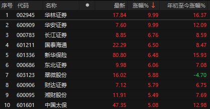 今天保险板块继续暴涨,新华保险涨超6%,中国太保涨超5%,另外由于上证指数站上4000点并有望冲击4100点,量能也大幅放大,刺激市场情绪回温,证券板块也爆发了,华林证券、华安证券涨停。