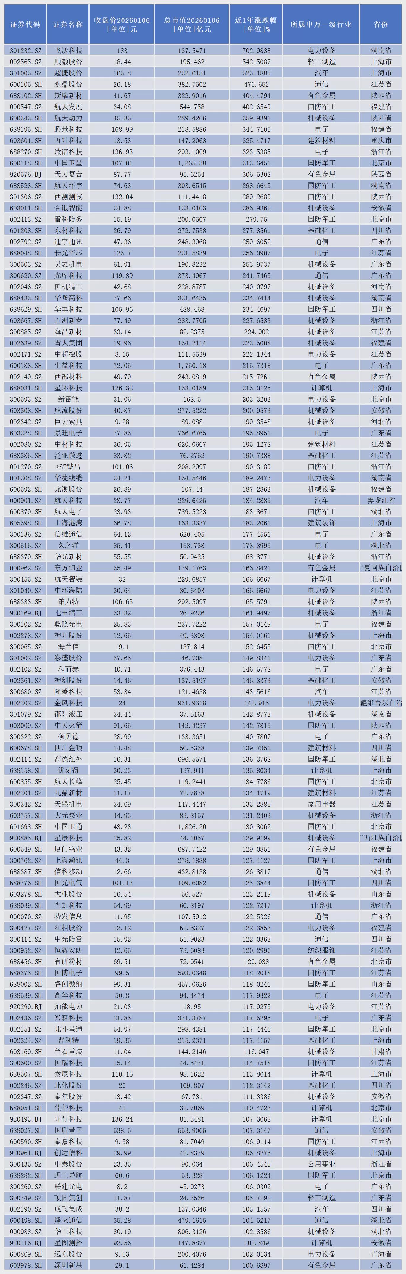其中,飞沃科技、顺灏股份、超捷股份、永鼎股份、斯瑞新材、航天发展、航天动力、腾景科技、再升科技、臻镭科技、中国卫星、天力复合、航天环宇、西测测试、合锻智能、雷科防务、东材科技、通宇通讯、长光华芯、昊志机电、光库科技、国机精工、华曙高科、华丰科技、五洲新春、海昌新材、雪人集团、中超控股、生益科技、西部材料、星环科技、新雷能、应流股份等33家公司股价累计涨幅超过200%。