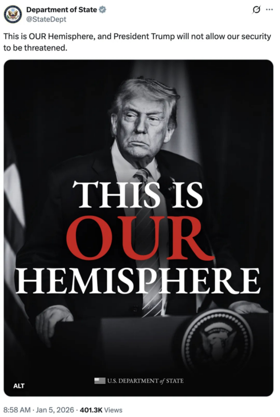 1月4日,特朗普在总统专机“空军一号”上强调,西半球是“我们(美国)的半球”,门罗主义很重要,很多美国总统忘记了它,“但我没有,我没有忘记”。他还一口气向委内瑞拉、哥伦比亚、古巴、伊朗、墨西哥、丹麦(格陵兰岛)等多个国家发出威胁,若不听话认怂就会有下一轮行动。