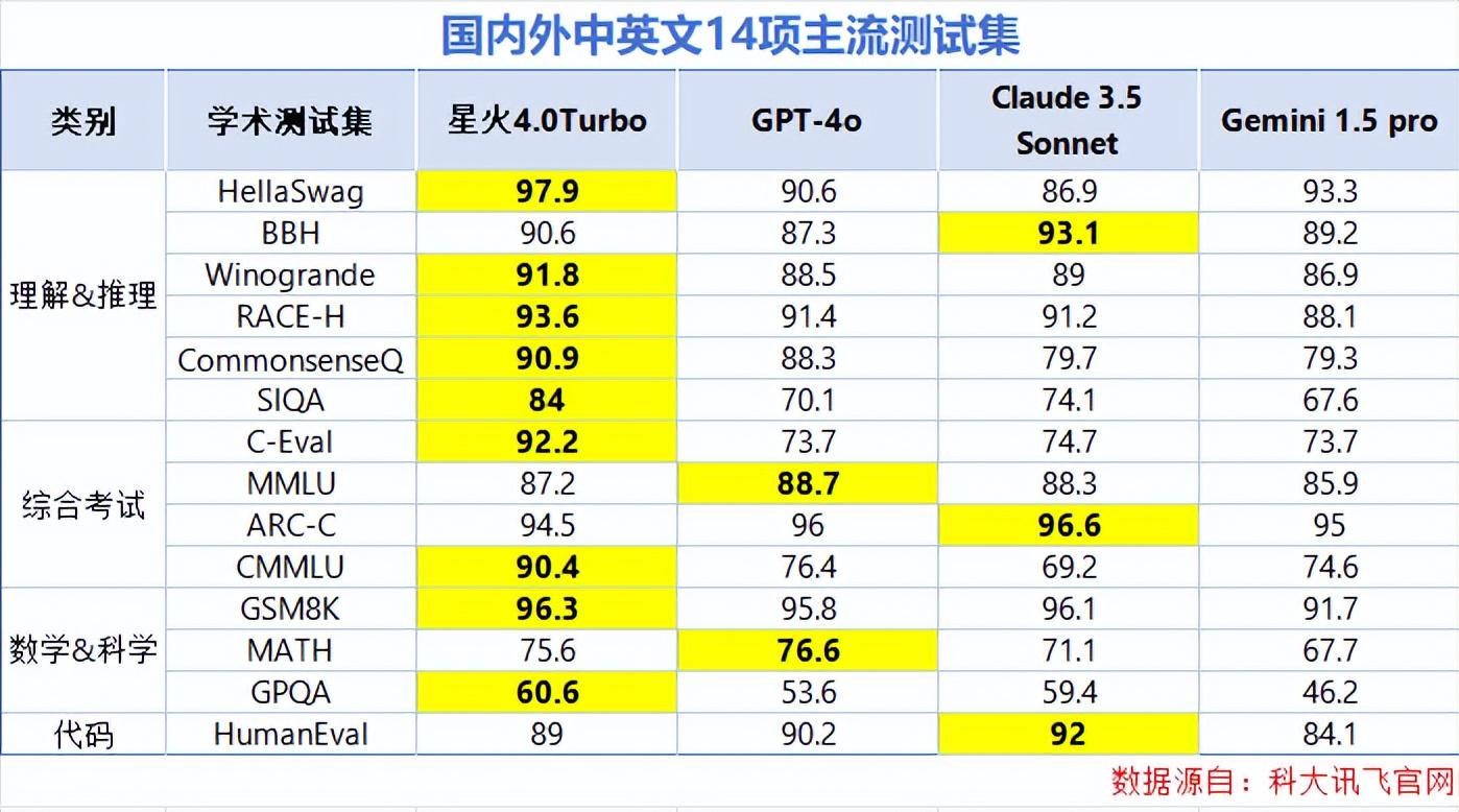 以2024年发布的讯飞星火4.0 Turbo为例,其在14项国际测试中斩获9项第一,多项能力超越GPT-4o,完全有实力在全球技术竞赛中占据一席之地。