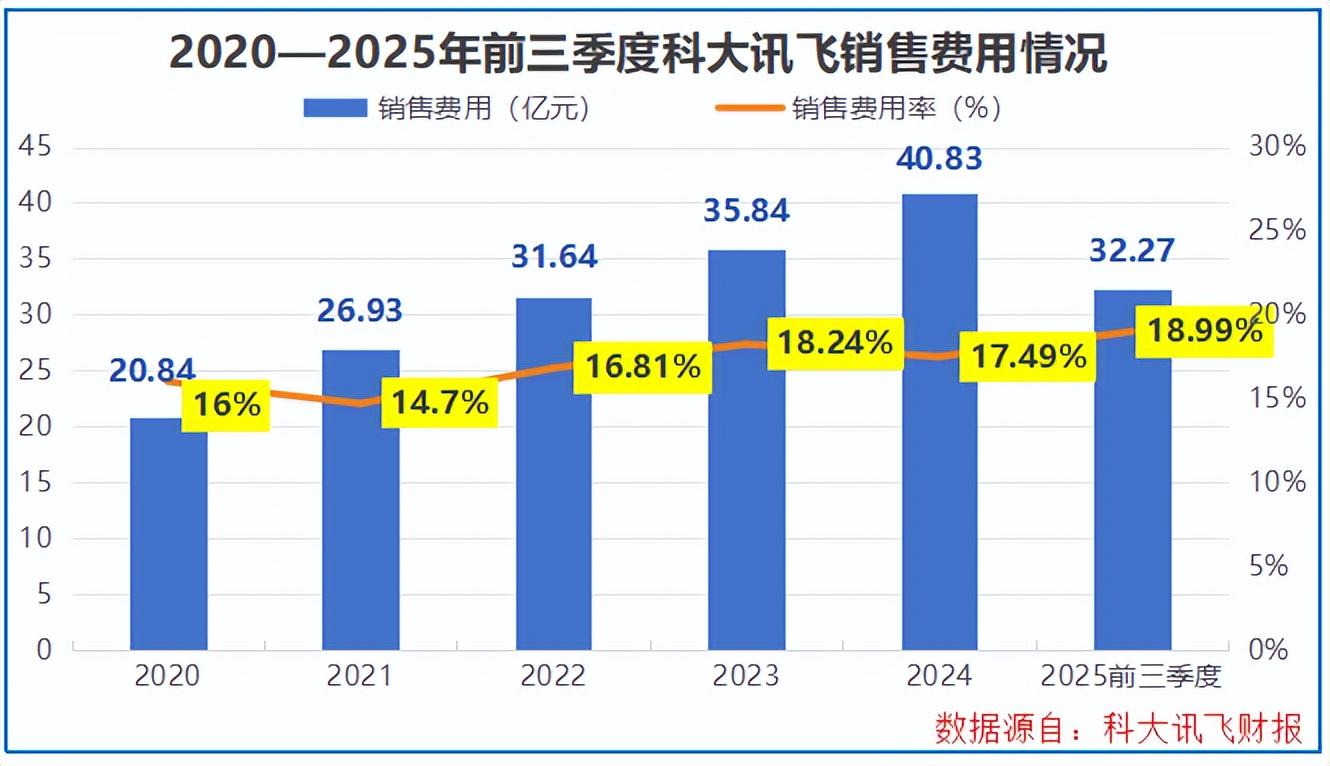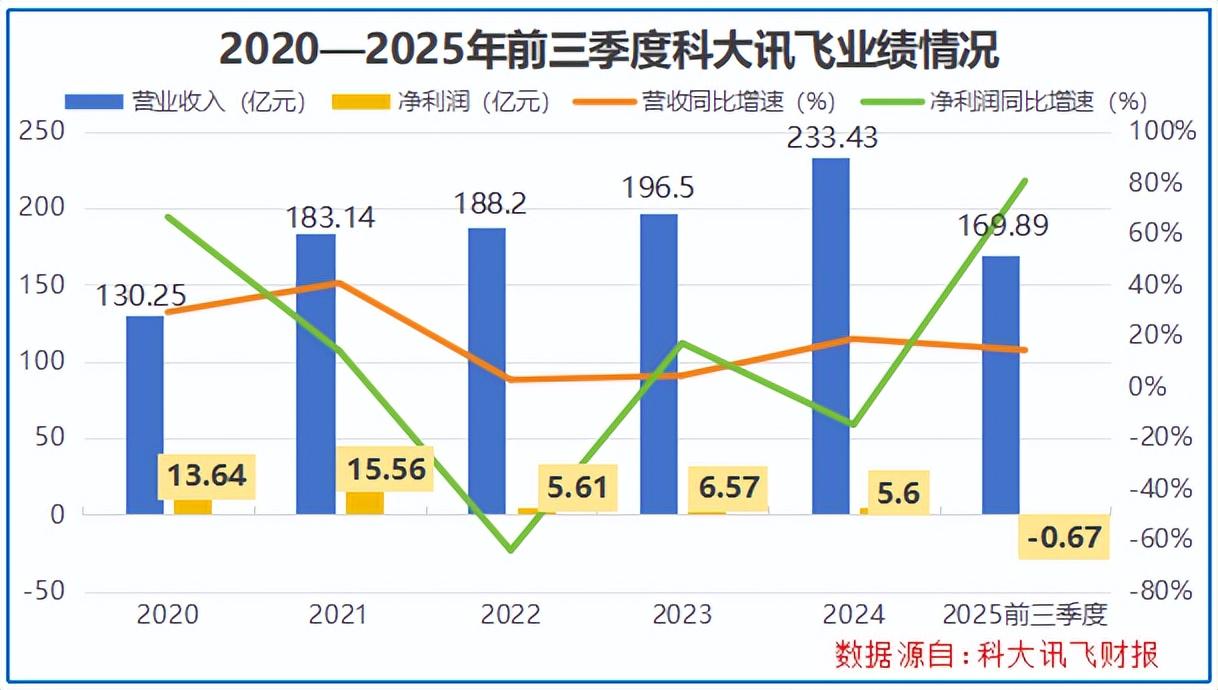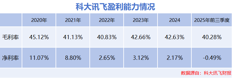 数据显示,2020-2025年前三季度,科大讯飞的毛利率一直在40%以上,这一水平在行业内并不算低,可见其业务本身具备一定的盈利基础。
