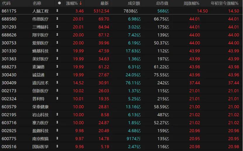 人脑工程概念股继续火爆,伟思医疗、三博脑科、翔宇医疗、爱朋医疗、美好医疗等17只相关个股涨停。