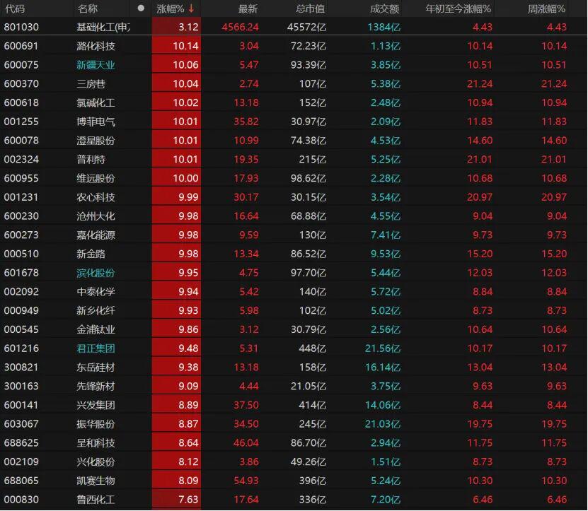 化工股掀起涨停潮,18只相关个股涨停,包括潞化科技、新疆天业等。