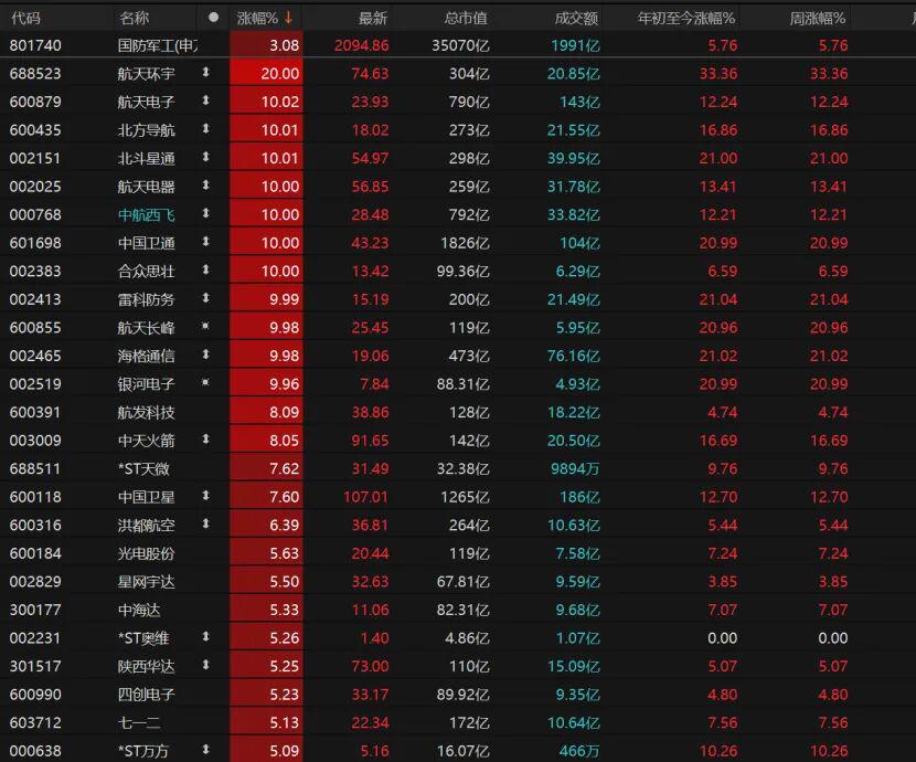 15只国防军工个股涨停,航天环宇“20cm”涨停,航天电子、北方导航、北斗星通、航天电器、中航西飞等涨停。