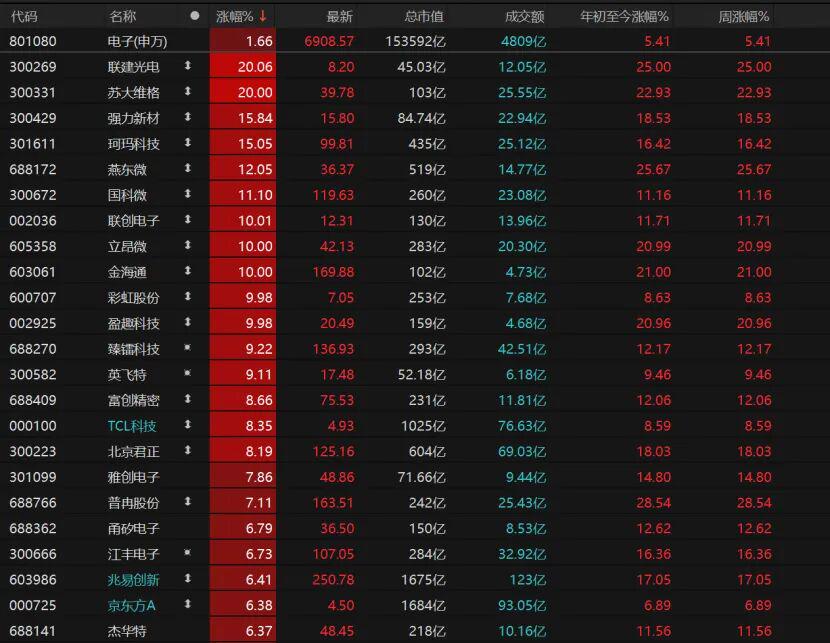 9只电子股涨停,联建光电、苏大维格“20cm”涨停,联创电子、立昂微、金海通均涨停。