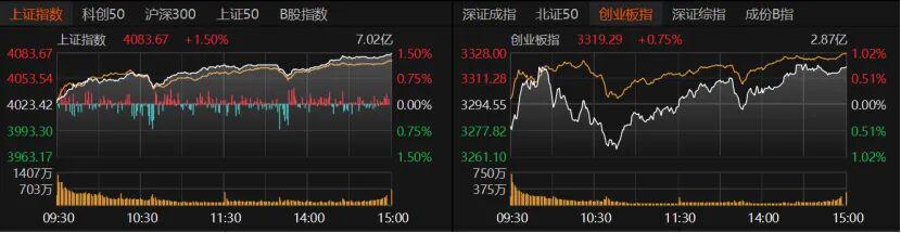 今日,A股延续量价齐升。沪指收涨1.5%报4083.67点;创业板指收涨0.75%报3319.29点,深证成指收涨1.4%。科创50、上证50、北证50、沪深300涨幅均接近2%。
