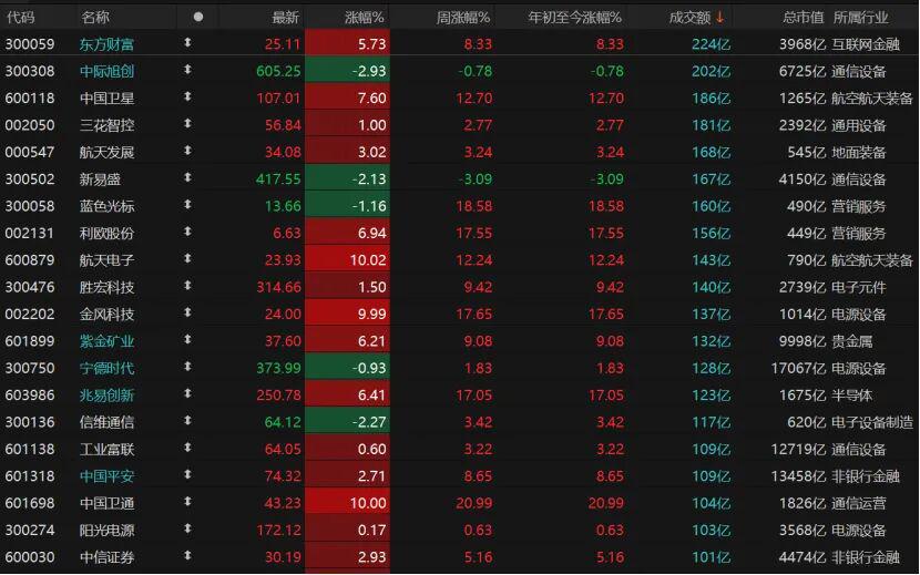 市场赚钱效应不错,4108只个股收涨,涨停股143只;1222只个股收跌,跌停股2只。20只个股日成交额超过100亿元,东方财富今日收涨5.73%报25.11元/股,日成交额224亿元;中际旭创跌近3%报605.25元/股,日成交额202亿元。中国卫星收涨7.6%,航天电子、金风科技、中国卫通涨停。