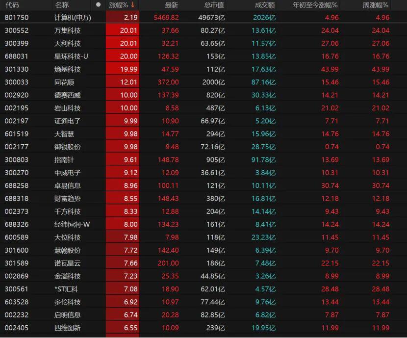 10只计算机个股涨停,万集科技、天利科技、星环科技-U、熵基科技“20cm”涨停,同花顺、大智慧、证通电子均涨停。