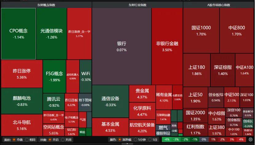 盘面上,CPO概念、光通信模块、F5G概念、通信设备等板块下跌,其余板块多数收涨。非银金融、贵金属、化学原料、基本金属、航空航天设备、北斗导航、虚拟机器人等板块均表现不错。