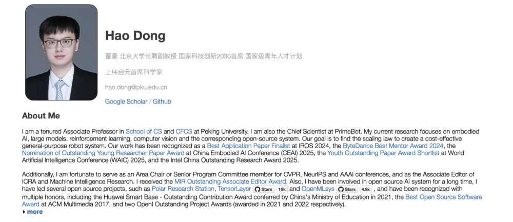 公开资料显示,董豪现任北京大学计算机学院前沿计算研究中心的长聘副教授,是科技创新2030国家重大项目负责人(首席科学家),并入选国家级高层次青年人才计划。其主要研究方向包括具身智能、强化学习、大模型、计算机视觉及机器人系统等前沿领域。