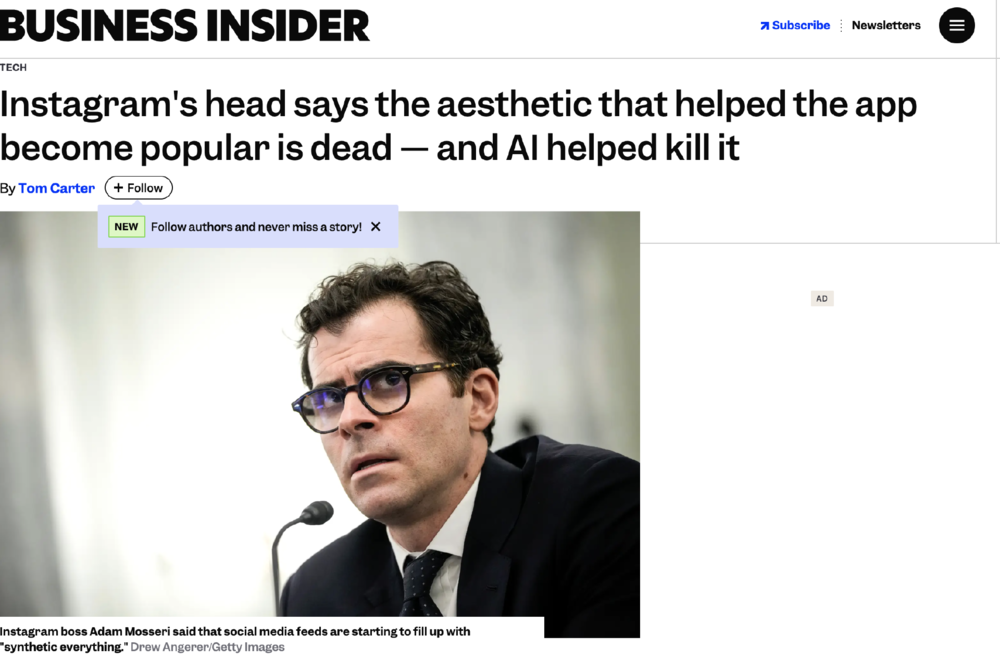 2026年1月1日《商业内幕》的报道证实了这一点,instagram负责人Adam Mosseri声称,人工智能的兴盛正让Ins美学消亡: