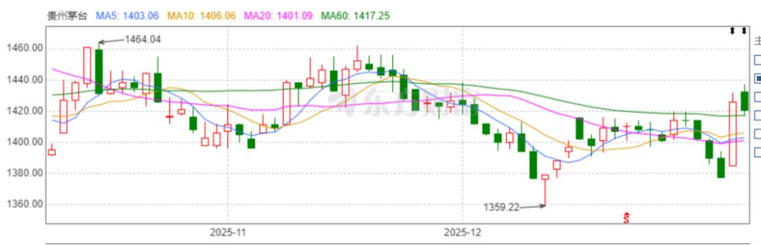 回顾2025年,茅台股价坐上了过山车,年初开盘价1472.44元,3月17日涨至1605.43元,涨幅9%。随后茅台股价开始一路下滑,6月16日跌至1349.62元,12月31日收盘价为1377.18元,年内茅台股价不涨反跌了6.5%,这在茅台身上并不常见。截至2025年12月31日,茅台最新市值为1.725万亿元。相比高点的3.02万亿元,已经蒸发了1.3万亿元。但在飞天茅台上线i茅台之后,新年第一个交易日,茅台股价大涨,1月5日茅台收盘价1426元,涨幅约3.54%,单日市值增长610亿元。