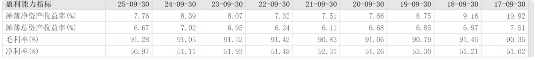 2024年茅台毛利率和净利率为91.93%和52.27%,2025年前三季度毛利率为91.29%,净利率为52.08%,整体上看下降不少,同比2024年前三季度91.53%毛利率和52.19%的净利率也有一定下滑。